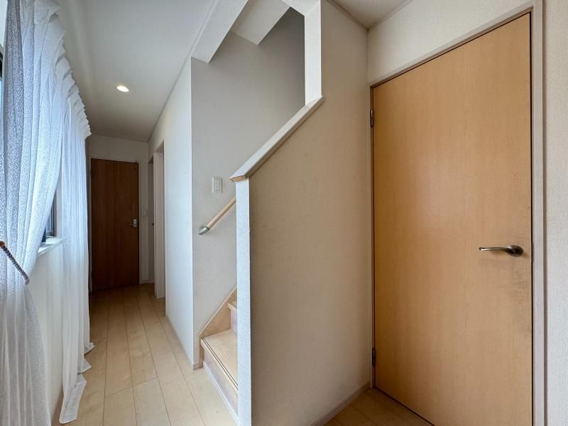 The interior is designed with practicality in mind. The living areas feature abundant storage, allowing for tidy and organized rooms. The hallway is bright with natural light streaming through the windows. The staircase is equipped with handrails, incorporating barrier-free design elements. The stylish kitchen is based on a black theme and includes an IH cooktop, a system kitchen, and a dishwasher. The bathroom has a small window for effective ventilation. The separate toilet is clean and well-maintained, and the washbasin area offers plenty of storage. The entrance also features ample storage space.