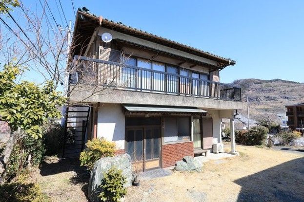 The house has many windows, allowing natural light to fill the entrance hall. The kitchen has distinctive wallpaper and floor patterns. The washroom conveys a sense of warmth from the wood. The tiled bathroom includes a bath heater. There is a comfortable toilet with a bidet function on the first floor, and a second-floor toilet with a window for natural light. The second floor features calming tatami spaces, including one with a well-appointed ceiling beam. A balcony on the second floor offers views of the surrounding mountain range.
