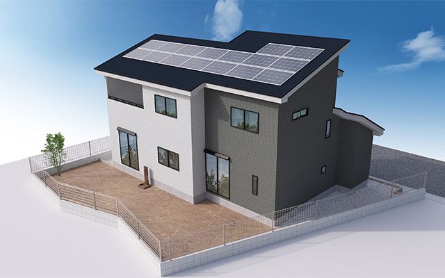 The house incorporates an all-electric system and is equipped with a solar power generation system, including a solar monitor. Key facilities include public water supply, Tokyo Electric Power, main sewerage, the all-electric setup, and the solar system. The kitchen is a counter-style, facing the living/dining area, and comes standard with an IH cooktop, dishwasher, and water purifier. Other notable features include a shower-equipped vanity, bathroom dryer, bathroom heating, two or more toilets (including water-saving models), double-glazed windows, and a TV monitor intercom. Storage is ample with a pantry and closets in all rooms.