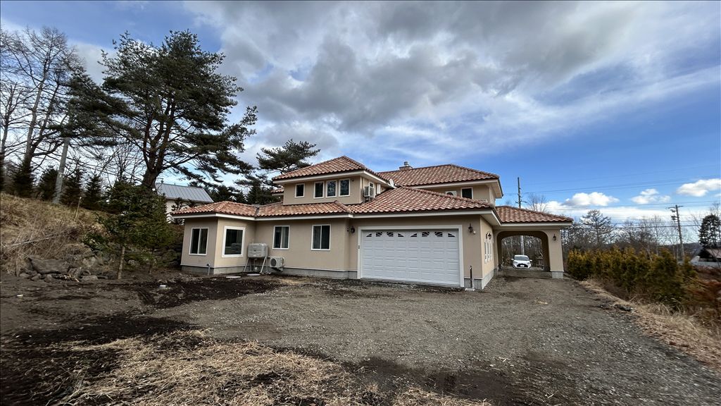 The villa is designed with a southeast-facing living room and garden, maximizing natural light. The land size is a generous 1,684 m² (approximately 509 tsubo), providing ample outdoor space not only on the southeast side but also offering potential for utilization on the northwest side of the plot. Key features include a two-story wooden structure, a system kitchen, a two-car built-in garage, and an additional car space. A covered carport allows for boarding without exposure to rain. The property is equipped with electricity from Chubu Electric Power Company and uses a private septic tank system. Heating is provided by a fireplace in the LDK area.