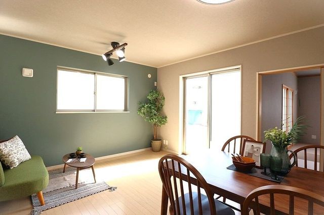 The home features a 3SLDK layout with a total floor area of 84.77 square meters. The south-facing living-dining-kitchen (LDK) area, approximately 14 tatami mats in size, is a highlight, with large windows that allow gentle, warm sunlight to fill the space. The kitchen is designed as a system kitchen with a counter, allowing the cook to oversee the living area and easily converse with family while preparing meals. The property is equipped with an all-electric system and utilizes city gas, which is noted for being relatively inexpensive and environmentally friendly.