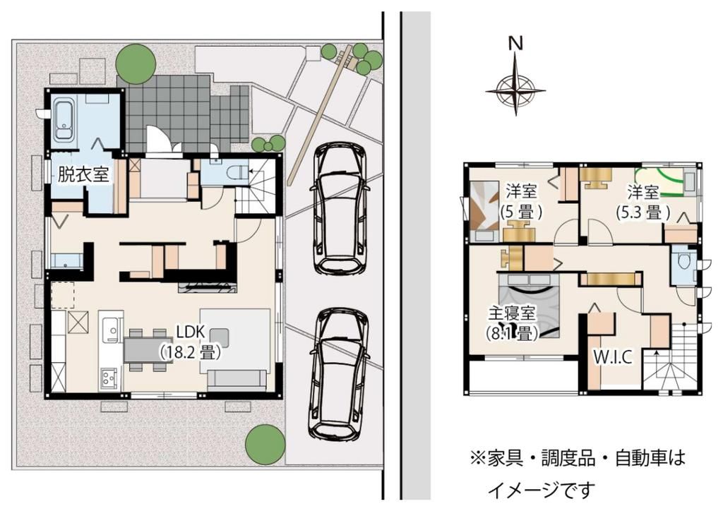 The home features a 3SLDK layout with a total floor area of 110.88 square meters. The spacious 18.2-jo (approximately 29.7 sqm) Living-Dining-Kitchen (LDK) is located on the first floor. The second floor comprises three Western-style rooms (5-jo, 5-jo, and 8-jo) and a 2.9-jo storage room. The property is equipped with an easy-to-clean IH cooktop, which helps prevent the room temperature from rising too high during summer cooking. As an all-electric home, it uses electricity for cooking and hot water, reducing the risk of fire. The bathroom includes a reheating function, allowing the family to enjoy a warm bath anytime. The property is also fitted with a 6.48kW solar power generation system, a 12kWh storage battery, and a Comfort Airy system.
