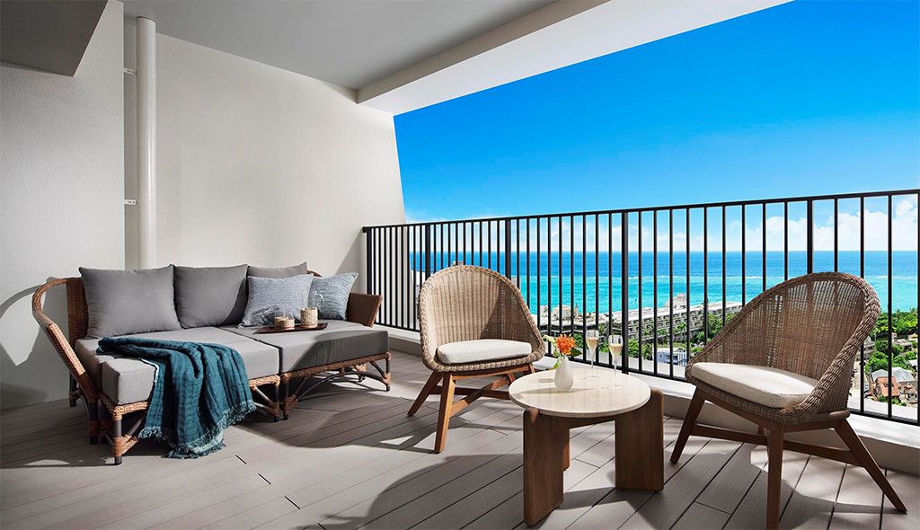 It is important to note that the provided photographs of the Lanai (A type) are composites. They combine images of a model room (A1 type) taken in October 2024 with a view photograph taken from approximately the 13th floor in July 2024, and therefore differ from the actual product. Similarly, the reception and lobby completion CG is a composite based on planning-stage drawings and a view photograph from approximately the 1st floor, taken in July 2024. Furnishings, fixtures, tiles, stone cladding, and landscaping are subject to change and are not guaranteed to match the images. The views from guest rooms vary depending on the floor and section, and neither the surrounding environment nor the views are guaranteed for the future.