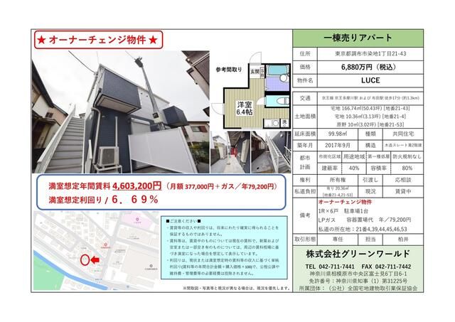 This well-maintained apartment building, constructed in September 2017, presents a compelling investment opportunity in the desirable residential area of Chofu, Tokyo. The property features a total of six units within a two-story wooden structure, offering a total building area of 99.98 square meters (approximately 30.24 tsubo) on a generous land plot of 166.74 square meters (approximately 50.43 tsubo). The building is currently fully tenanted, ensuring immediate rental income for the new owner.