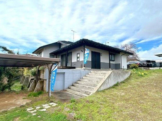 The property includes a carport with space for 2-4 vehicles. The location is in a quiet area with a 10m wide public road to the southeast. It is approximately 1.4km (an 18-minute walk) from Hanamaki Station on the Tohoku Main Line. Nearby amenities include a Trial supermarket and a FamilyMart convenience store, both about 350m away. Hanamaki Hospital is approximately 2.1km away, and Sakura-dai Elementary School is about an 18-minute walk.