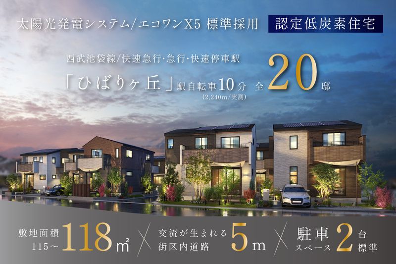 The homes feature modern amenities and eco-conscious design. Key specifications include a Cleanup STEDIA kitchen with a stainless-steel eco-cabinet and an integrated water purifier tap, a Lixil AX bathroom with thermostatic flooring, a Panasonic C-line washbasin vanity, and a Lixil Bacia toilet. Each house is equipped with a hybrid water heater (Eco One), underfloor heating in the living/dining area, and a FamiLock smart entry system. Solar panels are standard on all units, contributing to lower utility costs and earning the development "Certified Low-Carbon Housing" status. Exterior features include a community bench, a functional gate post with a parcel box, and the aforementioned lighting agreement for enhanced security and night-time streetscape beauty. Each home comes with two standard car parking spaces.