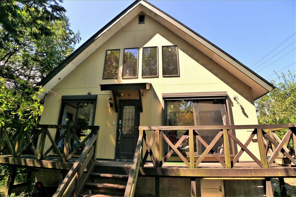 This two-story wooden vacation home is situated on a spacious, flat plot of approximately 93 tsubo (310 sqm) within the Toshou Neighborhood of the Nasu resort area. Built in October 2005, the property offers a 1LDK layout plus a loft, with a total floor area of 74.52 sqm. The living, dining, and kitchen area (LDK) is a generous 17.8 tatami mats in size and features a double-height ceiling, creating an open and airy atmosphere. A separate 6.0 tatami mat Japanese-style room provides additional flexible space. The property includes a wood deck offering views to the east and south, and is positioned on a corner lot with road frontage on two sides.