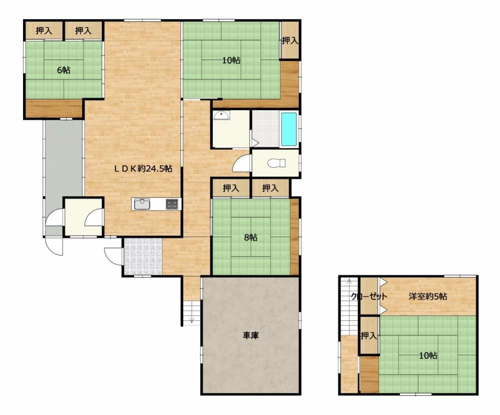 This fully renovated 4LDK (5LDK listed) detached house in Sakai City, Fukui Prefecture, offers a move-in ready solution for families seeking space and convenience. The property features a generous layout with a living room exceeding 20 tatami mats, a popular face-to-face kitchen, and multiple Japanese-style rooms. A key highlight is the substantial parking provision, including a two-car electric garage and an additional open-air parking space, accommodating up to three vehicles in total.