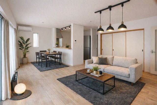 The house features a 4LDK layout with a total building area of 103.68 square meters. It includes a balcony area of 6.48 square meters. The property sits on a land area of 143.4 square meters (registered area). The structure is a two-story wooden building. Key equipment includes a system kitchen, counter kitchen, shower-equipped vanity, heated toilet seat, bath dryer, auto bath, two or more toilets, an indoor washing machine space, underfloor storage, storage in all rooms, a balcony, a roof balcony, and double-glazed windows. The property is equipped with propane gas, public water supply, and sewer systems. It features seismic and vibration control structures that meet the new earthquake resistance standards. The property also comes with certifications including a Design Housing Performance Evaluation Certificate and a Flat 35/S Conformity Certificate.