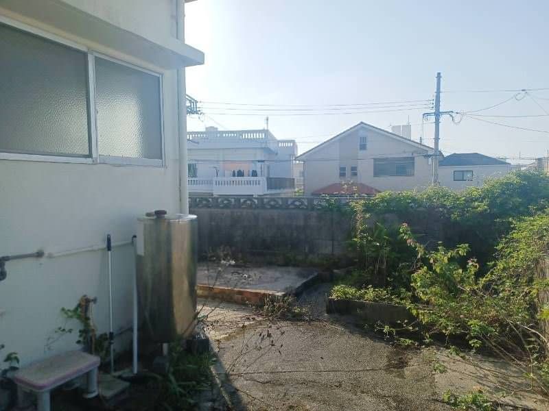 This is a 3LDK RC single-story house located in Oroku, Naha City, Okinawa Prefecture. The property is situated on a corner lot in a high location, offering good ventilation and a pleasant view from the rooftop. The building has a total floor area of 57.91 square meters on a land area of 174.81 square meters. It was built in August 1967 (approximately 59 years old) and has a reinforced concrete (RC) structure. The property is a vacant house with all ownership rights. The layout includes a living/dining/kitchen area, a Japanese-style room (6 tatami mats) near the entrance, a Japanese-style room (6 tatami mats), a Western-style room (6 tatami mats), and a separate toilet, bathroom, and laundry area. The property features a system kitchen, counter kitchen, an IH cooking stove, a gas cooking stove, a reheating function for the bath, a bathroom dryer, a shower-equipped vanity, a heated toilet seat, a walk-in closet, storage in all rooms, a TV monitor intercom, and underfloor heating. The property is all-electric and barrier-free. It faces south and has a dedicated garden and parking space. The property is located a 2-minute walk from the "Jutakumae" bus stop. Nearby amenities include Ueohara Elementary School (882m away), Kagamihara Junior High School (958m away), Town Plaza Kanehide Oroku Market (308m away), and a Seven-Eleven (527m away).