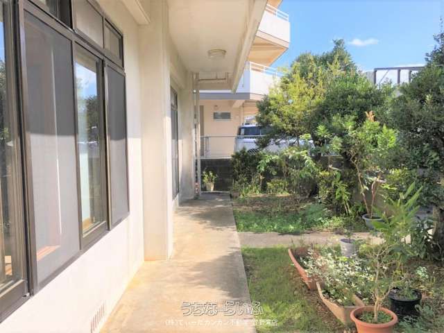 The location is within walking distance of Ginowan Elementary School (11 minutes) and Ginowan Junior High School (19 minutes). A bus stop is approximately a 6-minute walk away. The current status is that the owner is in residence. The property includes parking for three cars. The agent suggests the potential to renovate the property into a two-generation household home, and notes that expanding the garden area for parking could allow for up to approximately six parking spaces in total.
