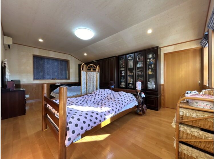 This charming two-story wooden house, built in October 2001, offers a unique and comfortable living experience in the peaceful, green residential area of Shizugaoka, Fukui City. The property's standout feature is its expansive, open-plan living, dining, and kitchen area (LDK), which includes a Japanese-style room and totals approximately 29 tatami mats in size. This central space is enhanced by a double-height ceiling (吹抜け) and a cozy wood-burning stove, creating a bright and airy atmosphere perfect for relaxation and family gatherings.