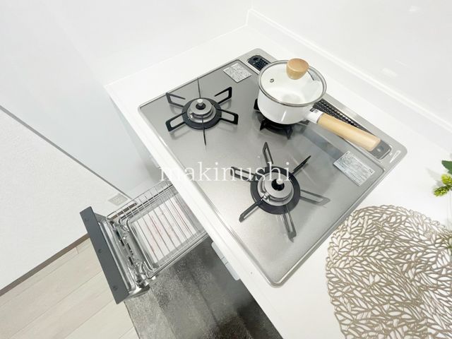 The layout includes a bright and airy living-dining area of approximately 14.0 tatami mats, providing a flexible space for family relaxation and gatherings. A notable feature is the approximately 8.0 tatami mat Japanese-style room, which includes a tokonoma (alcove), making it suitable for use as a guest room. The property is equipped with a user-friendly system kitchen featuring a flat countertop for easy cleaning, a spacious sink, a three-burner gas hob for simultaneous cooking, and a range hood. The bathroom is bright with natural light to aid ventilation and prevent mold, and includes a reheating function for the bath. Both the first and second floors have toilets, each fitted with a comfortable warm-water washing toilet seat (bidet). Additional amenities include a three-mirror vanity in the washroom with ample storage, two closets for clothing, and a bright, well-ventilated roof balcony suitable for drying laundry. Parking is available with a built-in garage for one car at no extra cost.