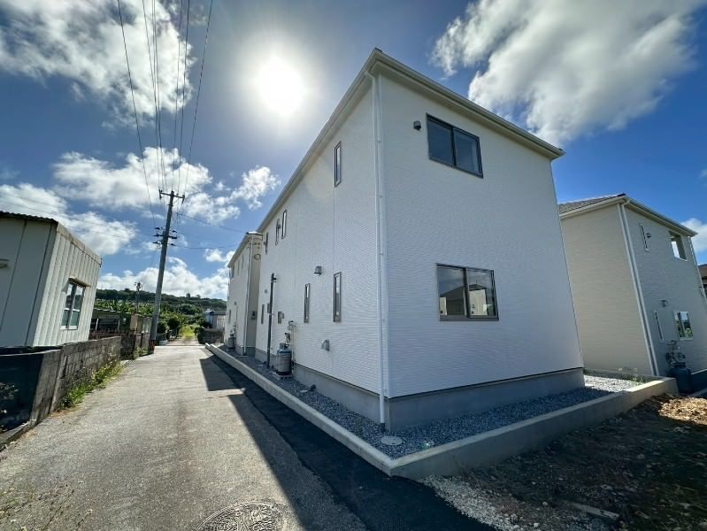 This new two-story house in Itoman City, Okinawa, offers a spacious 4LDK layout with a total floor area of approximately 95.58 square meters. The property features a walk-in closet, under-floor storage, and a system kitchen. Built with wood, it includes two parking spaces and is ready for immediate occupancy.