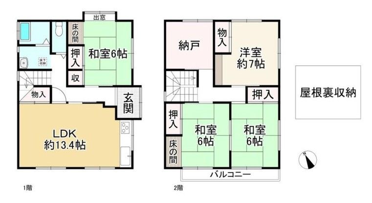 This detached house, located in Nogohara 1-chome, Otsu City, Shiga Prefecture, offers a spacious 4SLDK layout with a total floor area of 105.16 square meters. The property sits on a corner lot with a land area of 101.79 square meters. The house was built in October 1987, making it 39 years old, and is a two-story wooden structure. The property is currently vacant.