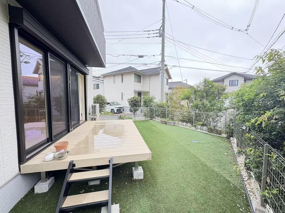 Outdoor living is enhanced by a south-facing garden with artificial turf and a wooden deck, perfect for barbecues, gardening, and family relaxation. Parking is available for two vehicles. The location is in a quiet, green residential area within a land readjustment district. The neighborhood offers convenient access to daily amenities: Foodone Hachioji Horinouchi supermarket is 854m away, a FamilyMart convenience store is 850m away, and a Welpark drugstore is 940m away. Public transportation access is provided by the Keio Sagamihara Line's "Keio Horinouchi" Station, approximately a 23-minute walk away.