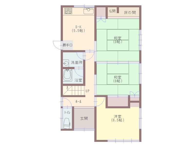 Key equipment and features include a system kitchen with a counter, which integrates storage space and is easy to clean and maintain. The property uses propane gas, which provides strong heat for quick bath heating and cooking, and offers faster recovery in case of disasters. The bathroom is tiled and features a window for proper ventilation. The toilet is equipped with handrails. There is a dedicated indoor space for a washing machine, which helps prolong the appliance's lifespan. Other notable features include a walk-in closet, storage in all rooms, a TV monitor doorphone, and underfloor heating. The property is south-facing, includes a free parking space for one car, and is barrier-free. Utilities include public water supply, propane gas, and sewer system.