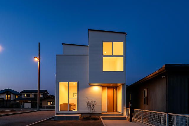 This newly built detached house, located in a quiet residential area of Inazawa City, Aichi Prefecture, offers a stylish and modern living experience. The property features a simple cube-shaped exterior that presents a sleek and contemporary design, looking striking both day and night. Upon entering, you are greeted by an impressive sense of openness, thanks to a generous entrance hall with a high ceiling of 2.7 meters.