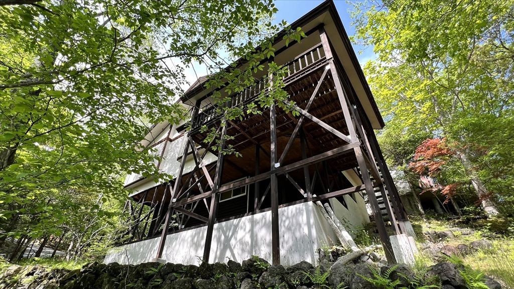 This detached villa is located in the Higashi (East) area of the Karuizawa Sen-gataki Villa District. The property offers a spacious living and dining area with a double-height ceiling and openings on two sides, creating a wonderfully open and airy atmosphere. A key feature is the expansive deck that provides sweeping views of Karuizawa's lush, deep green forests to the southwest.