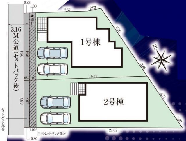 Special notes detail the road access, which is a 3.1-meter wide public road on the west side with a frontage of 5.9 meters. The property is set back by 13.09㎡ and includes free parking for two vehicles. This information pertains specifically to the on-site [Building No. 2]. The construction is confirmed and meets standards for Long-Term Excellent Housing and Flat 35S suitability.