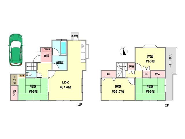 The house itself is a 2-storey wooden structure built in February 1995, with a total floor area of 91.08 square meters. The layout is a spacious 4LDK, featuring a living-dining-kitchen area of over 12 tatami mats for relaxed family living. A Japanese-style room offers versatility for use as a bedroom, dining area, or other purposes, and includes a traditional Japanese closet (oshiire) for ample storage. The land is a flat, easy-to-use plot of 100.66 square meters.
