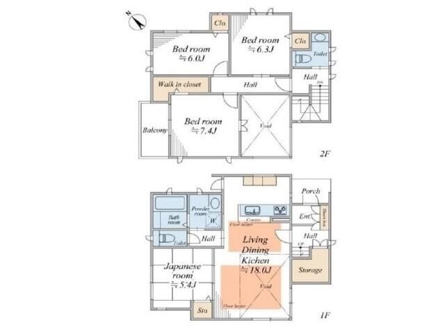 The home's interior features a bright and airy living room with a high ceiling and underfloor heating, providing warmth and comfort from the feet up during winter. The layout includes four bedrooms and a combined living, dining, and kitchen area. The bedrooms consist of one Japanese-style room (5.4 tatami mats) and three Western-style rooms (7.4, 6.3, and 6 tatami mats respectively), with the spacious LDK measuring 18 tatami mats. Two adjacent rooms are connected by sliding doors, allowing for privacy while maintaining a sense of connection. The property is equipped with two toilets (both with warm-water washlet seats), a bathroom with a window and shower, a vanity counter, a counter kitchen with an IH cooking heater, ample storage including closets and a walk-in closet in all rooms, hardwood flooring throughout, and a monitor-equipped intercom. Utilities include electricity, tap water, and sewerage.