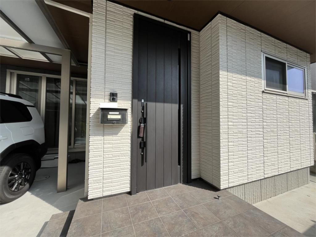 The home is equipped with a full range of modern amenities. The kitchen is a counter-style kitchen with an IH cooktop, which helps keep the room cooler during summer cooking and is easy to clean. The living-dining-kitchen (LDK) area is a spacious 18.5 tatami mats. A key feature is the second-floor children's room, which can be partitioned into two separate rooms in the future, offering flexible living space. The house includes a walk-in closet, storage in all rooms, and a generous entrance with a shoes-in closet (SIC) and shoe boxes. The entrance door has a double lock plus a convenient remote control key. The bathroom is spacious and comfortable, featuring a reheating function for the bath and a dryer ('乾太くん'), useful for drying laundry on rainy days and for drying the bathroom itself after use. The separate washroom and changing area are also spacious, with a clothes-drying rack above. The first-floor toilet is tankless for easy cleaning and includes a hand-wash counter convenient for small children. A second toilet is located on the second floor for added convenience. Other equipment includes a shower-equipped washbasin, heated toilet seat, underfloor heating, air conditioning, indoor laundry machine space, internet readiness, dishwasher/dryer, solar power generation system, and lighting fixtures included. The property is all-electric, barrier-free, south-facing, and comes with a parking space.