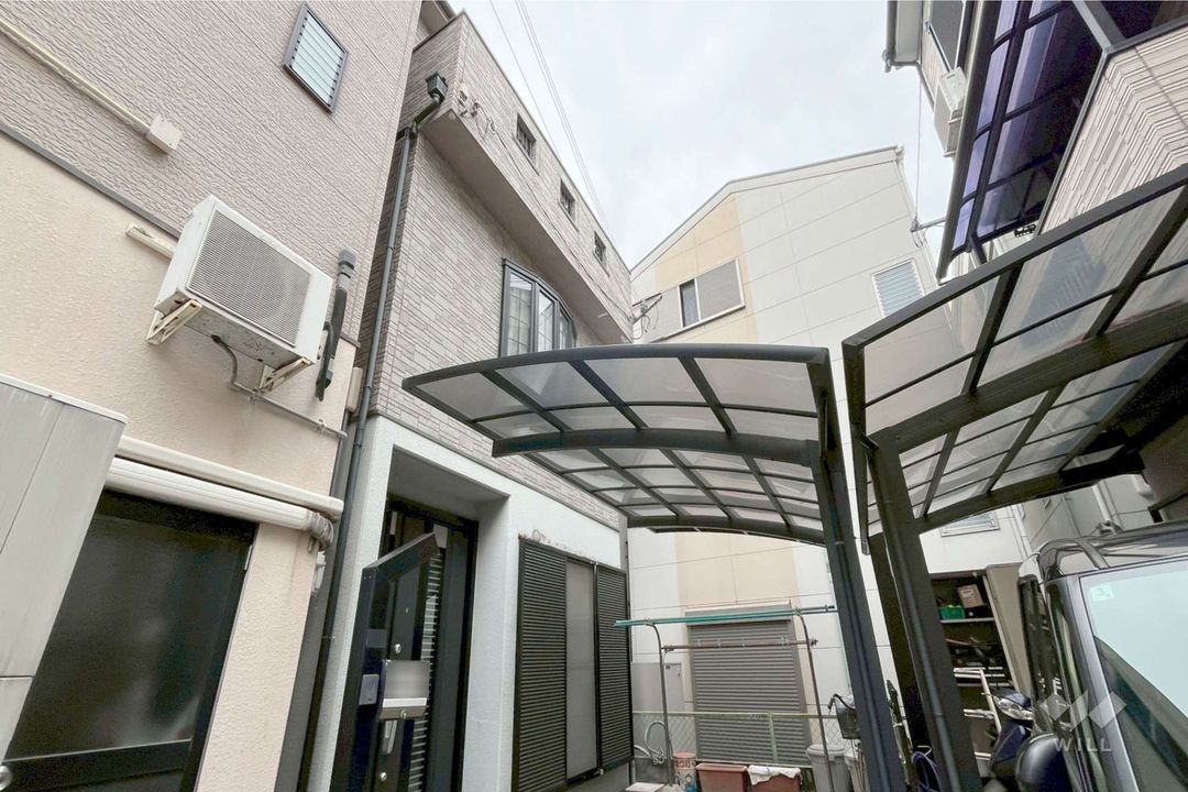 The property's equipment and features are comprehensive. The kitchen is noted for its abundant storage and workspace, equipped with a three-burner gas stove. There are two kitchens in total, one on the first floor and another on the second floor, both being wall-mounted to create an open feel in the dining areas. The living-dining-kitchen (LDK) on the second floor is designed for privacy, with a layout that avoids external sightlines. It features built-in storage with doors to keep daily essentials tidy. The house includes two toilets, one on the first and one on the second floor, for convenience during busy mornings. The bathroom has a window for natural ventilation. Other notable features include a shower-equipped vanity, a TV monitor intercom, underfloor heating, and a carport for one vehicle. The property is connected to public water, city gas, and sewer systems.