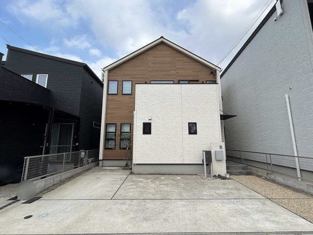 The building features a bright, open-plan LDK (living, dining, kitchen) area with a high ceiling and a top light, creating a spacious and relaxing atmosphere of approximately 20.7 tatami mats. A living room staircase is designed to foster family communication. The kitchen is a face-to-face style, encouraging conversation, and includes a cupboard on the backside and a separate service entrance. Underfloor heating is installed in the living, dining, and kitchen areas. Each floor has a toilet, and one of the Western-style rooms (approx. 6.7 tatami mats) includes a walk-in closet. A convenient storage room is located on the second floor, and a hand-washing basin is installed in the entranceway. The property can accommodate parking for two standard cars.