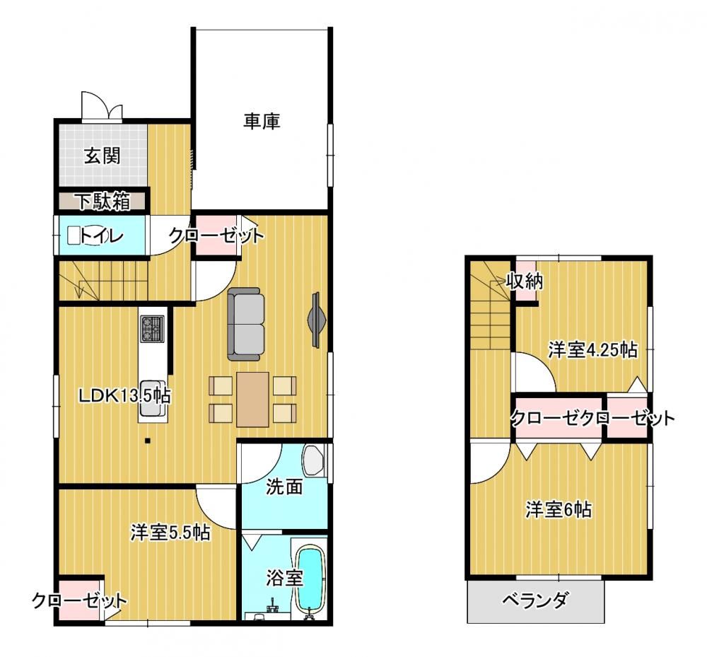 The renovation encompasses all key areas. The kitchen has been replaced with a brand new Eida Industries system kitchen featuring a quiet, splash-resistant sink. The bathroom is a new 1-tsubo (approx. 3.3 sqm) size Hau-stec unit bath with a spacious tub. The toilet is a new Janis unit. The washbasin is scheduled to be a new Panasonic AWE model, 750mm wide, made of durable artificial marble with a shower attachment. The front door has been replaced with a new swing-type door, and the entrance interior features tile flooring and a shoe cabinet. First-floor sashes have been replaced with new ones. Flooring throughout has been redone with overlay flooring, and walls and ceilings have been redone with plasterboard and new wallpaper.