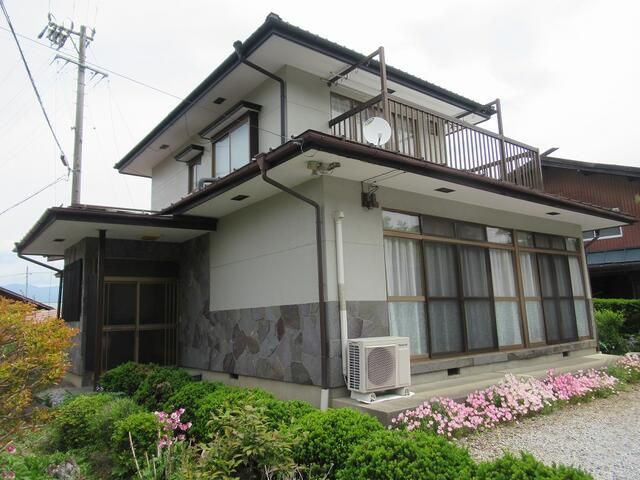 This property is a detached house for sale located in a quiet residential area of Suwa City, Nagano Prefecture. The house itself, built in July 1973, is a two-story wooden structure with a total floor area of 105.91㎡ (approximately 32.03 tsubo), offering a 5DK layout. The layout includes four Japanese-style rooms (4.5, 6, 8, and 6 tatami mats) and one Western-style room (8 tatami mats). The property sits on a generous plot of land measuring 552.91㎡ (approximately 167.25 tsubo).