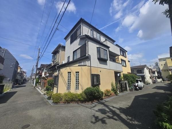This is a 4LDK used detached house located in Sakae-cho 2-chome, Takatsuki City, Osaka Prefecture. The property features a southeast corner lot, providing excellent sunlight exposure throughout the day. The building is a three-story wooden structure with a total floor area of 105.40 square meters on a land area of 59.84 square meters. The property was built in January 1999 and is currently occupied. It includes a built-in garage for one car, protecting vehicles from rain. The interior layout offers three 8-tatami mat rooms, contributing to a spacious 4LDK floor plan. The property features a system kitchen with a gas stove and a counter kitchen. The bathroom includes a reheating function and a bathroom dryer. The vanity has a shower attachment, and the toilet is equipped with a washlet. Additional interior features include a walk-in closet, storage in all rooms, a TV monitor intercom, and floor heating. The property is all-electric and barrier-free. Utilities include public water supply, city gas, and sewage. A balcony is also present. The neighborhood is a quiet residential area. The property is located approximately a 22-minute walk from Tonda Station on the Hankyu Kyoto Line. Nearby amenities include a convenience store (Seven-Eleven) 373 meters away, a supermarket (Friend Mart) 616 meters away, a drugstore (Drug Segami) 560 meters away, and a home center (Kohnan) 1324 meters away. Elementary and junior high schools are within walking distance.