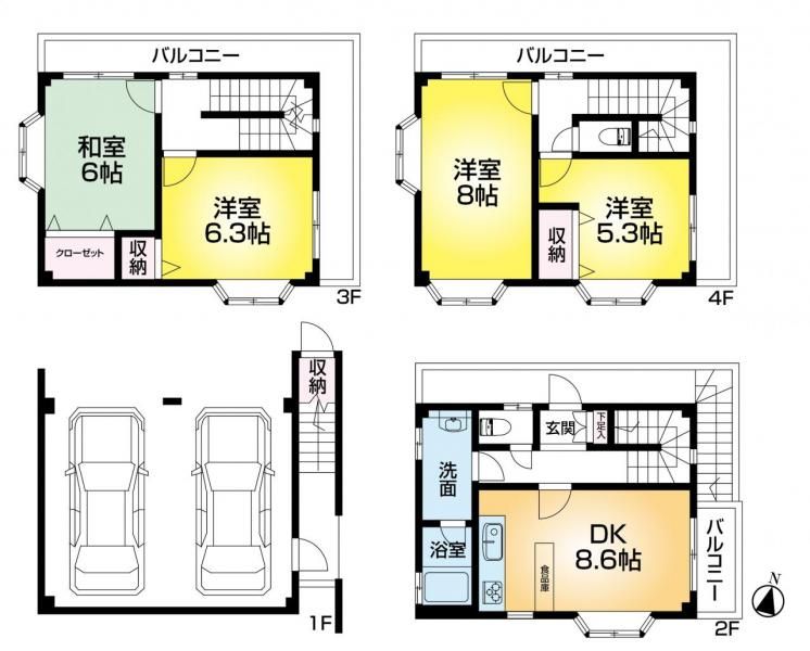 Key features of the property include a second-floor living room design that offers privacy from outside views, a two-sided balcony for good airflow, and a shutter-equipped garage to protect vehicles from the elements. The home is equipped with a system kitchen that integrates storage and is easy to clean and maintain. Other notable equipment includes a monitor-equipped doorphone for security, underfloor heating, a walk-in closet, storage in all rooms, a shower-equipped vanity, a jetted bath, a bidet toilet seat, and separate bathroom and toilet facilities. The property is all-electric and incorporates barrier-free design elements. It is south-facing and comes with parking for two or more vehicles.
