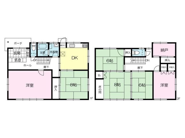 This substantial two-story wooden house, built in December 1980, offers a generous 157.10 square meters of living space on a 208.66 square meter plot of land in Kobe's Nagata Ward. The property is conveniently located just a 6-minute walk from Maruyama Station on the Kobe Electric Railway Arima Line, providing excellent access to the wider Kobe area. The south-facing orientation is a significant advantage, ensuring the home is warm in winter and facilitates quick drying of laundry.