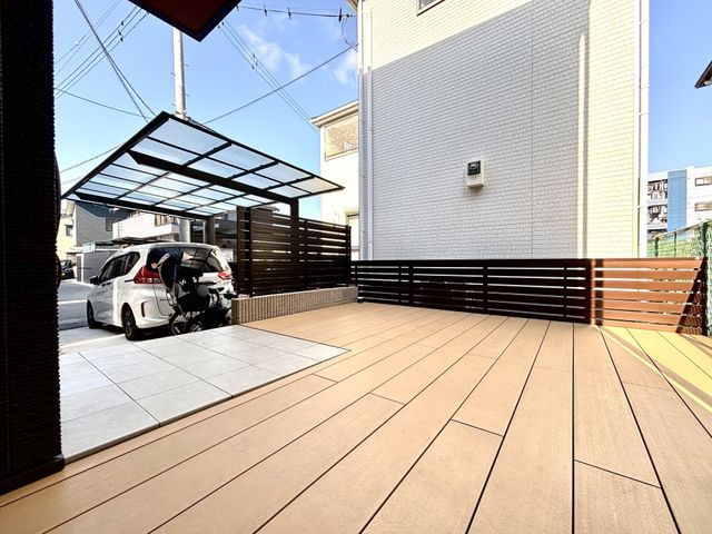 The kitchen is equipped with a counter kitchen that allows for communication with family while cooking, and a system kitchen that integrates storage and other functions for easy cleaning and maintenance. The property is all-electric, which reduces the risk of fire by not using gas for cooking or hot water supply. Other equipment includes a floor heating system, a walk-in closet, storage in all rooms, a TV monitor intercom, a bathroom dryer, a shower-equipped vanity, a heated toilet seat, a dishwasher, a shoe-in closet, a solar power generation system, a smart key, a pantry, a high ceiling, and a wood deck. The property also includes a parking space for one car (free). The property is a long-term excellent housing certified property.