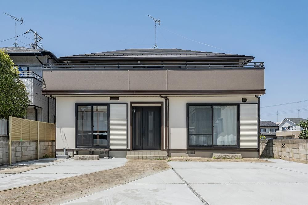 The property features a spacious LDK of approximately 23.9 tatami mats with a ceiling height of about 2.6m, providing a sense of openness. The building frontage exceeds 10m, presenting a substantial presence in the streetscape with a dark-colored exterior that has been newly painted. The layout is a 4LDK+S (storage room) with a study and walk-in closet. Both the first and second floors feature a user-friendly circular floorplan centered around the staircase, improving household efficiency. The southeast-facing living room is generously sized at over 23 tatami mats.