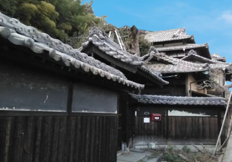 愛媛県今治市石井町に位置する、昭和7年(1932年)建築の木造二階建て住宅です。この物件は、かつて法人の事務所兼邸宅として使用されていましたが、現在は3年前から空き家となっています。厳密な古民家というほどではありませんが、現在では入手困難な屋久島杉の一枚板など、貴重な材木が使用された、しっかりとした構造の建物です。特に印象的なのは、重厚な門構えで、当時の建築の風格を今に伝えています。