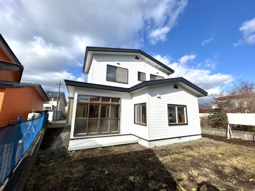 This fully renovated 4LDK detached house in Noboribetsu, Hokkaido, offers a move-in ready family home with significant recent upgrades. The property has undergone a comprehensive renovation, including the demolition of the old garage to expand the parking area, exterior wall and roof painting, and replacement of the entrance door with a thermally insulated model. The landscaping has been tidied, with plants and trees around the house trimmed back for a cleaner look.