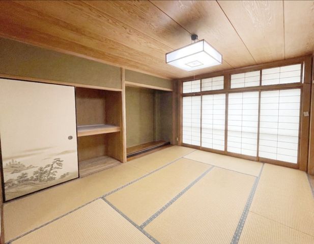 The home features a mix of Japanese-style and Western-style rooms. The approximately 9-jo (tatami mat) dining kitchen offers a spacious work area with abundant storage. There are several Japanese-style rooms, including an 8-jo room on the first floor with soft light filtering through its shoji screens, and another 8-jo room on the second floor which includes a tokonoma (alcove). The second floor also includes a 6.5-jo Western-style room with a retro atmosphere and a 5-jo Western-style room that provides access to a balcony. The property includes a dedicated bathroom and toilet, a tile-walled bath with a window for ventilation, and an independent washbasin area with storage shelves for daily necessities. Other equipment includes an indoor washing machine space, underfloor storage, a balcony, flooring, lighting fixtures, and a water heater. The property uses propane gas, which provides strong火力 for baths and cooking, shortening preparation time and offering quicker recovery in disaster situations.