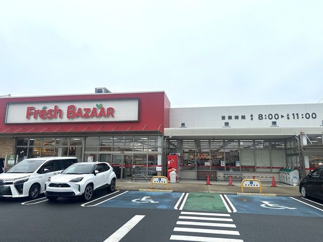 The location offers convenient access to daily amenities. The JR Sanin Main Line's Fukuchiyama Station is approximately an 11-minute walk away, providing train connectivity. The municipal bus stop 'Okano Nichome' is about a 2-minute walk from the site. Nearby facilities include Fukuchiyama City Hall (410m), Junmei Elementary School (430m), a drugstore (510m), a post office (660m), a home improvement store (570m), a bank (700m), a convenience store (740m), and a supermarket (820m). The land is serviced by public water supply, city gas, and sewer systems.
