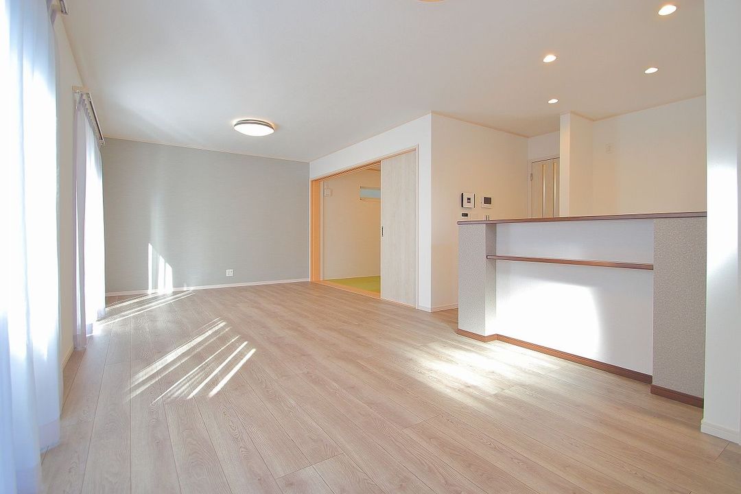 The house features a 4LDK layout with a total floor area of 107.82 sqm (approximately 32.61 tsubo). The land area is 139.31 sqm (approximately 42.14 tsubo). The property is built using the 2x4 construction method and incorporates seismic dampers for enhanced earthquake resistance. The living, dining, and kitchen area (LDK) is spacious at approximately 19.5 tatami mats and includes a face-to-face kitchen layout with a dishwasher. The home is equipped with numerous amenities including underfloor heating in the LDK, a bathroom with a drying function, a TOTO Premist toilet, an EV outlet, Low-E double-glazed resin sash windows, a pocket key system at the entrance, and a home security system (fee-based).