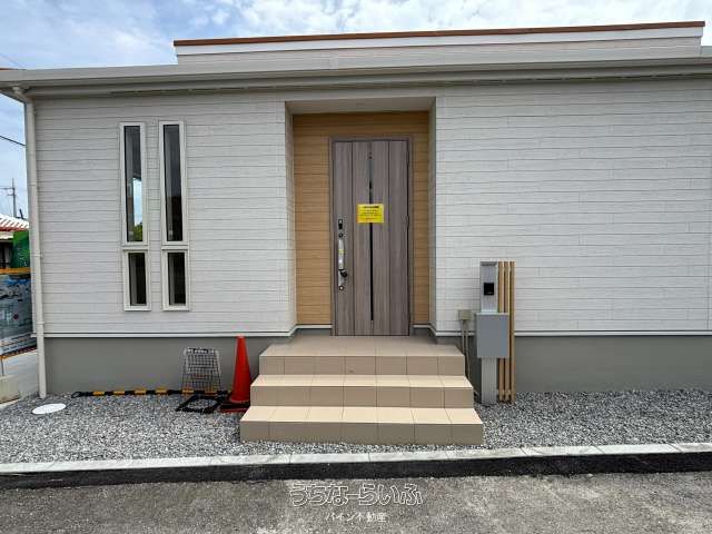 This newly completed single-story house, built in December 2025, offers a modern and comfortable living space in the quiet residential area of Afuso, Onna Village, Okinawa. The property features a spacious 3LDK layout with a total floor area of 93.57m² (28.3 tsubo). The interior includes a Western-style room measuring 8 tatami mats, another at 6.5 mats, and a third at 5.2 mats, complemented by a 17.5-mat LDK (living, dining, kitchen) area. Practical amenities are well-considered, with two walk-in closets (WIC), a laundry room, and a pantry for ample storage. The property sits on a generous 204.78m² (61.94 tsubo) corner lot, a key feature highlighted by the agent. The land is described as a corner plot with southern road frontage, an extended and irregularly shaped yet well-ordered parcel, flat, and south-facing, ensuring excellent sunlight.