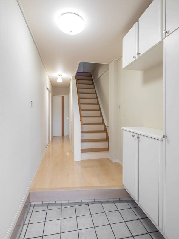 The house features a generous 115.65 sqm of floor space across three stories. The heart of the home is a bright, 17.6-tatami mat LDK (living, dining, kitchen) area with two-sided windows that ensure excellent natural light and ventilation. The north, west, and east sides face a road and parking area, further enhancing airflow. The kitchen is a counter-style design, allowing for interaction with family while cooking. Key equipment includes a system kitchen, IH cooktop, bathroom dryer, shower-equipped vanity, heated toilet seat, and underfloor heating. The property is all-electric. Additional features include a walk-in closet, storage in all rooms, and a TV monitor intercom. The first floor includes a Japanese-style room, making it safe for small children or elderly residents. There are five rooms in addition to the living room, offering flexibility for use as studies, children's rooms, or hobby spaces. Each room on the third floor has a closet for ample storage. The property includes two free parking spaces.