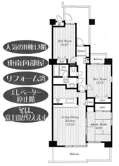 This well-presented apartment, located on the 13th floor of a 14-story reinforced concrete building constructed in January 1989, offers a comfortable and convenient lifestyle in Higashikurume City, Tokyo. The property features a generous 76.59 m² (approximately 23.16 tsubo) of exclusive wall-core area arranged in a practical 3LDK layout. The living-dining-kitchen (LDK) area is a spacious 15.3 tatami mats, complemented by one Japanese-style room of 6 mats and two Western-style rooms of 6.7 and 6.4 mats. A key feature is the 13.67 m² south-facing balcony, providing excellent natural light.