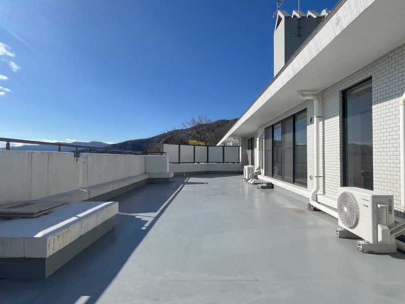 This property is a spacious 2LDK condominium located on the top floor of Lions Mansion Atami Izusan, offering a corner unit with a generous 74.91 square meters of private floor area. The unit features a large 22.36 square meter balcony that includes a roof balcony area, providing expansive outdoor space with multiple orientations (south, east, and north). Built in 1991, this 35-year-old building is a 5-story reinforced concrete structure with a total of 28 units, situated in the scenic Izusan area of Atami City, Shizuoka Prefecture.