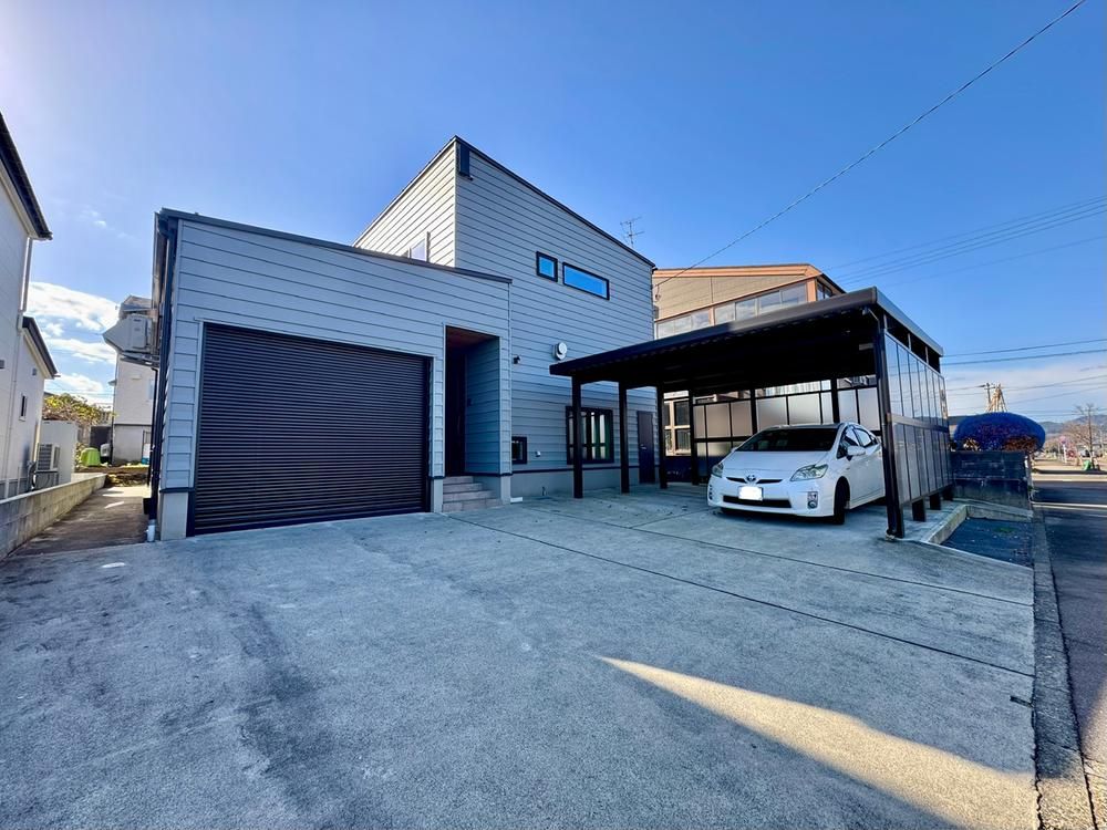 This contemporary detached house, built in October 2019 (Reiwa 1), offers a blend of high design and advanced energy efficiency. The property features a modern exterior combining heavy metal horizontal siding with a warm wooden front door, harmonizing with a showcase garage for a functional yet aesthetically pleasing appearance.