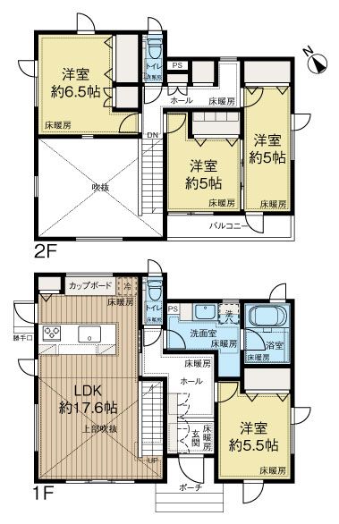 The property is equipped with a modern system kitchen featuring a counter and an IH cooktop. The bathroom includes a reheating function and a dryer. Additional interior amenities include a walk-in closet, storage in all rooms, a TV monitor-equipped door phone, and underfloor heating. Key features of the home are its all-electric system, barrier-free design, and a south-facing orientation for good sunlight.