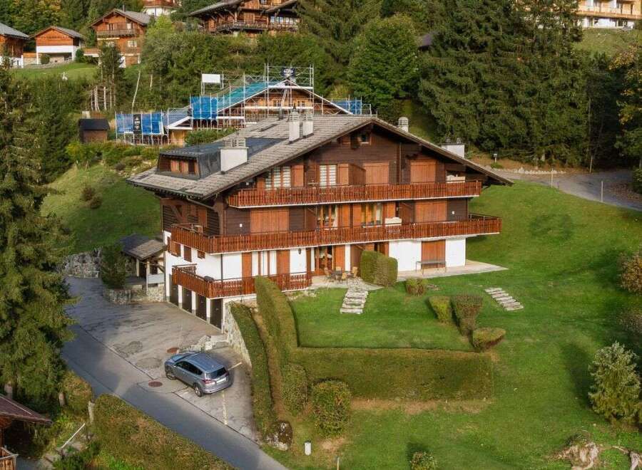 This charming three-bedroom, one-bathroom apartment is situated within the private park of Le Domaine de La Résidence in Villars, a location uniquely bordered by ski runs. The property benefits from a breathtaking panoramic view of the Swiss Alps, a feature that defines its appeal. Occupying the top floor of the building, the apartment enjoys the characterful volume created by the chalet's roof structure, adding to its rustic charm.