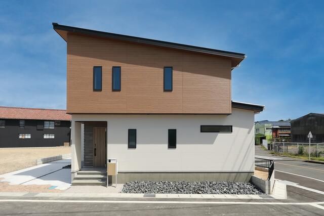 This newly built detached house, scheduled for completion in August 2025, offers a modern living experience in a developing neighborhood of Tokoname City, Aichi Prefecture. Priced at 34.9 million yen, the property is part of a new nine-lot community and is designated as a Long-Term Superior Housing, potentially qualifying for subsidies. The house features a distinctive exterior with a contrast of white and wood grain.