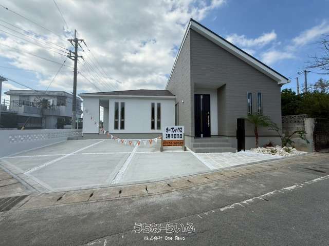 This newly constructed single-story house in Uruma City's Ishikawa Akasaki district offers a modern 3LDK layout with a total floor area of 97.5m². The property sits on a spacious 200.65m² plot of land, which is flat and features a south-facing road. The house is currently under construction with a scheduled completion date of March 2026.